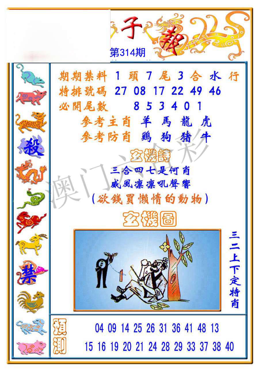 | 314期:(香港挂牌)平一肖【虎】开:?00 |